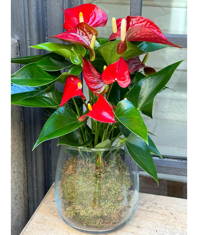 Kokedama de Anthuriumcon jarrón de cristal