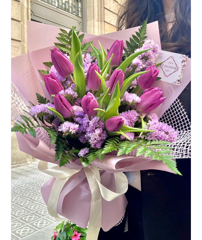 Imagina un ramo vibrante donde los tulipanes morados se abren en una danza de tonalidades. Desde el púrpura intenso hasta el lila suave, cada flor aporta su propia magia, creando una experiencia visual única.